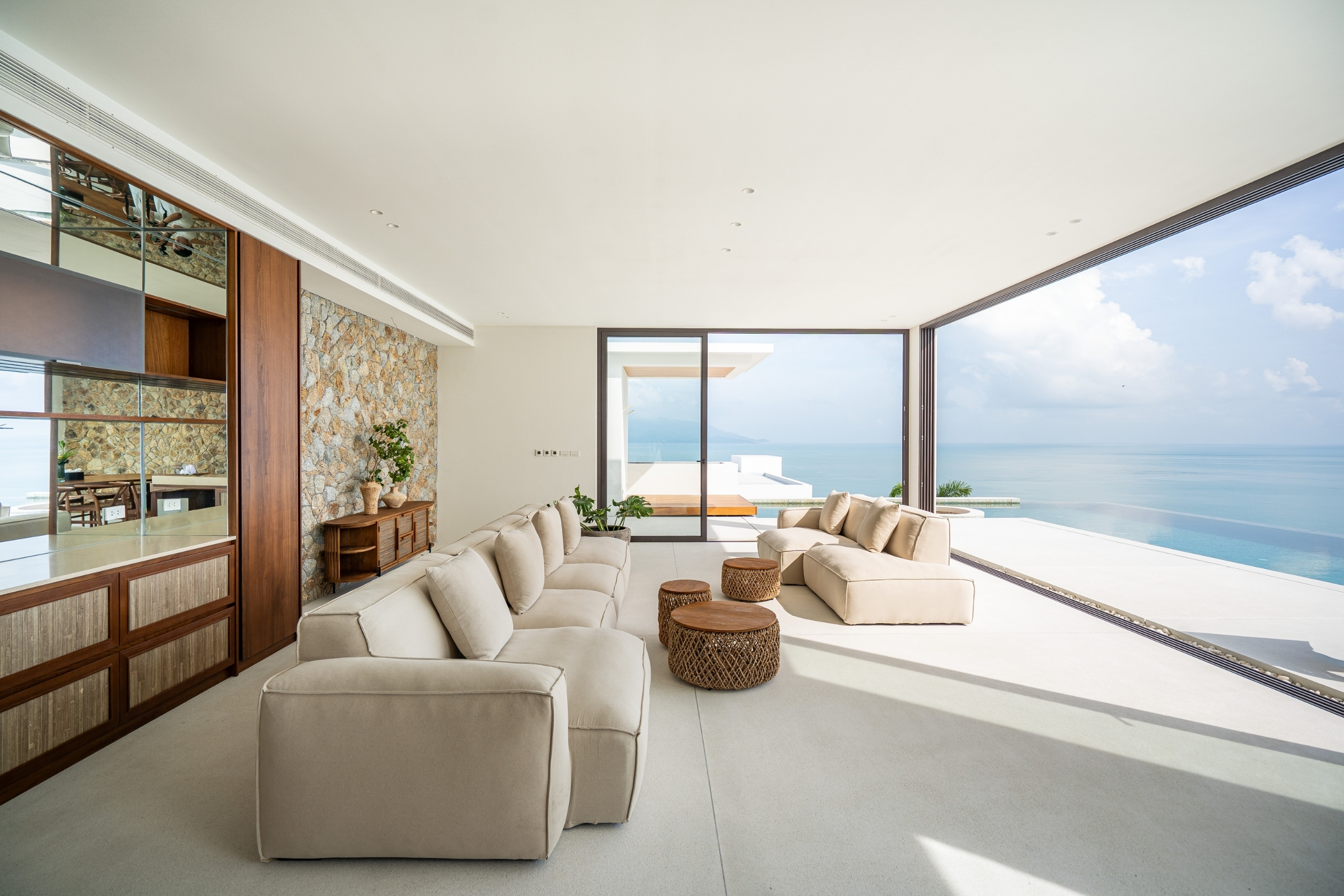 Where contemporary elegance meets the raw beauty of the coast, seamless indoor-outdoor living spaces flow naturally into panoramic infinity pools and expansive garden lawns, creating a setting where the horizon becomes part of everyday living.
